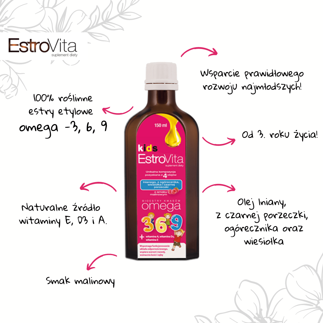 EstroVita kids to suplement diety o najwyżej skoncentrowanej zawartość roślinnych kwasów tłuszczowych omega-3,6,9, które są nieocenionym uzupełnieniem diety dziecka.